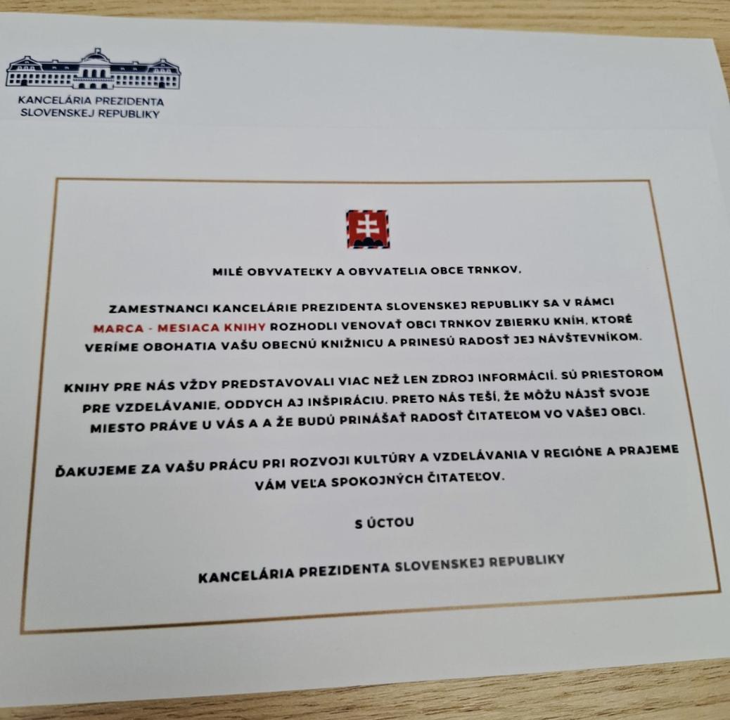 Obecná knižnica Trnkov prijala knižný dar z Kancelárie prezidenta SR